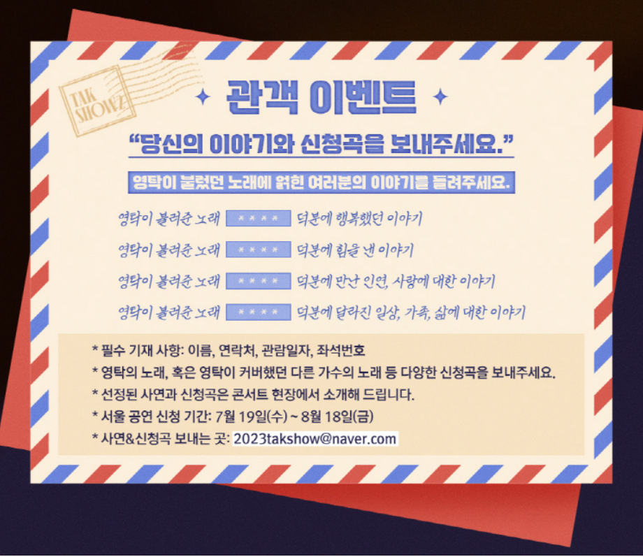 단독콘서트인 만큼 관객과 소통하고 관객의 소리 듣고 같이 불러 줄 노래도 준비하고 있다고 하니 많은 분들이 사연 보내 주셔서 영탁과 같이 기억에 남을 여름날 보내 보아요!!!
